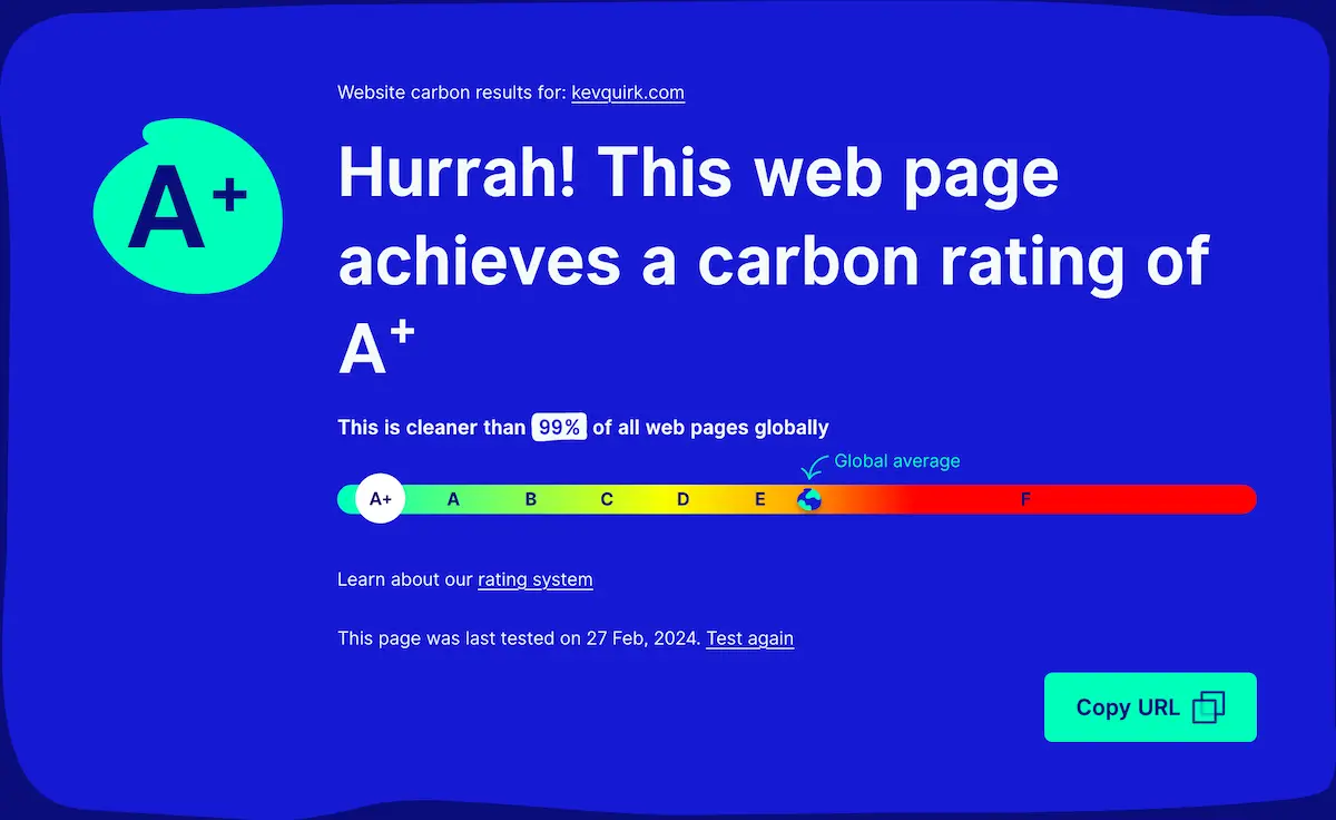 14 June 2024 @ 12:06 That'll do, pig. https://www.websitecarbon.com/website/kevquirk-com/ Reply by email ⬅ The one before 📝 2024-06-14 11:38 Up next ➡ 📝 2024-06-15 13:19