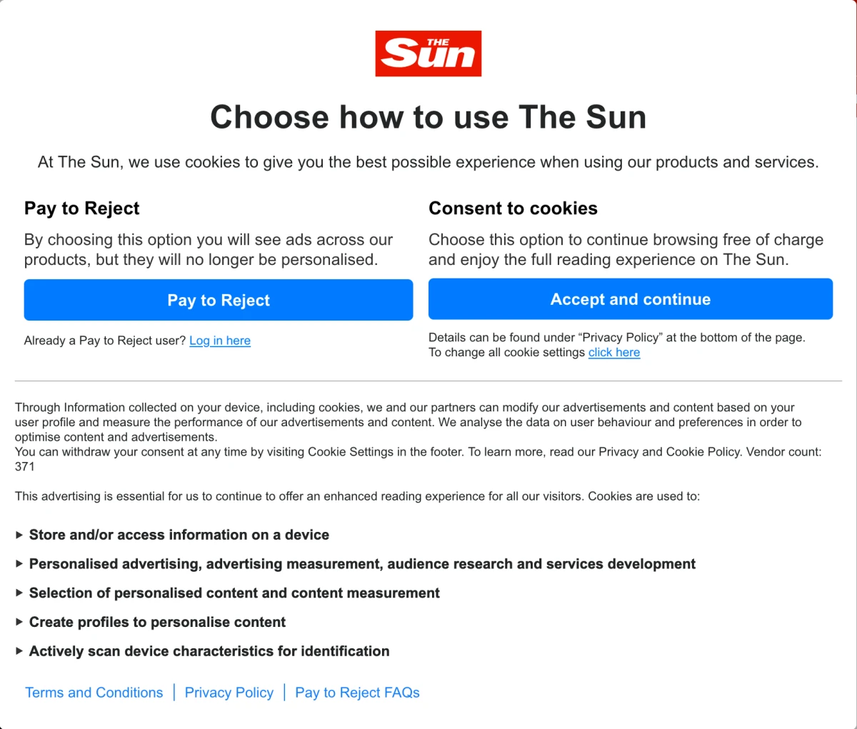 Was searching for something and I clicked on a Sun link (🤢). Anyway, I got this popup. What the actual fuck, we now have to pay to be able to reject cookies??