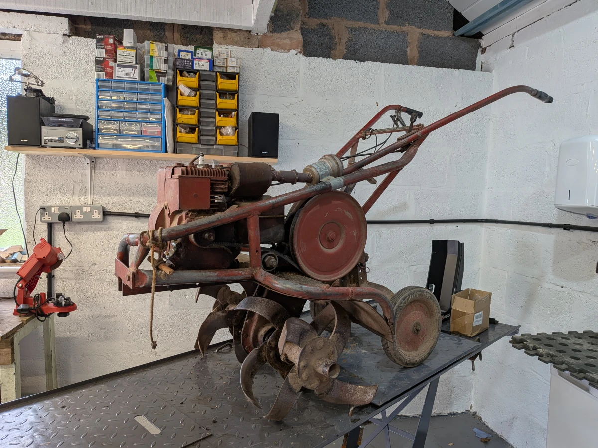 Most of the time it's motorbikes up on my lift, but every now and then weird stuff make their way on there too, like this 60 year old soil tiller...
