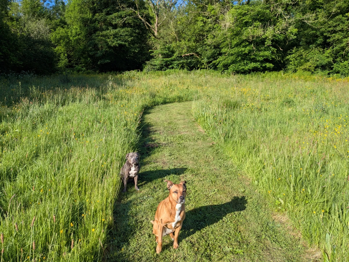 It's a beautiful morning in north Wales, so instead of taking the dogs on their usual lead walk, we're up in the fields.