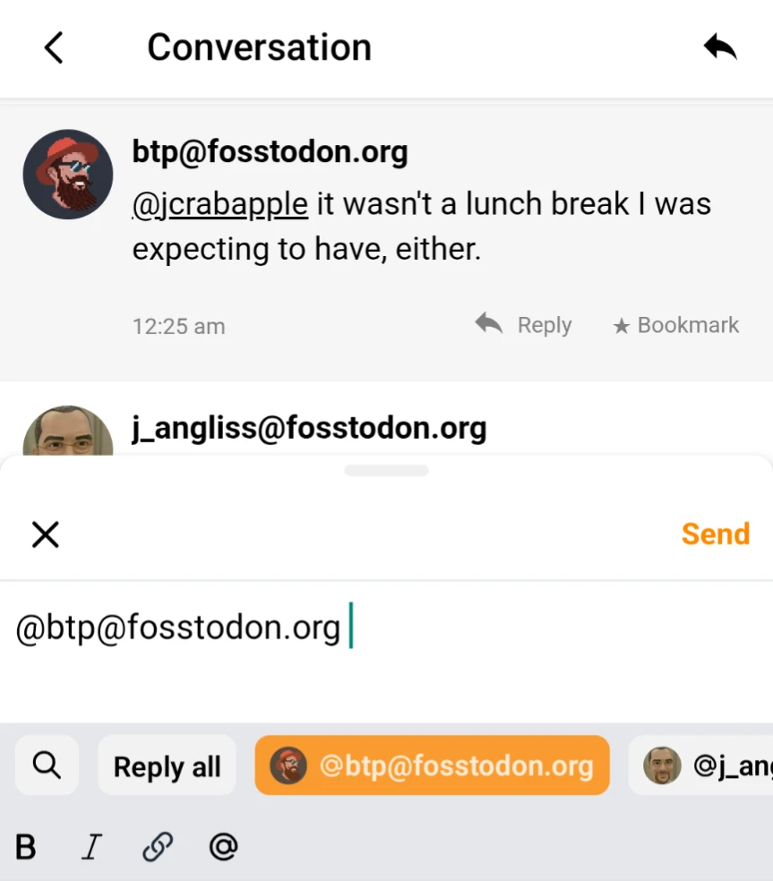 One of the things that's been frustrating me about #MicroBlog is that it only ever replies to a single person. If I want to reply to multiple, I have to remember their handle.