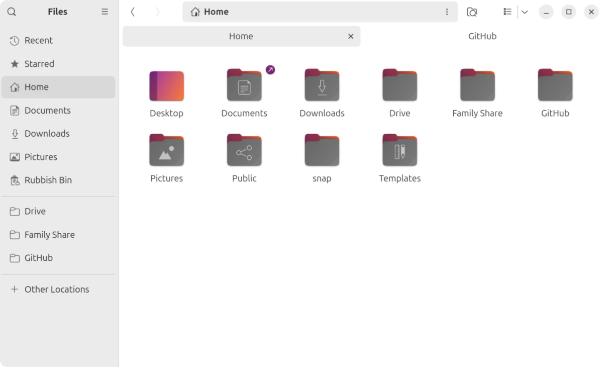 One of the things that really annoys me about #Ubuntu are tabs on the Files app. The colours are back to front. If you look at the image attached, "Home" is the active tab here, not "GitHub".